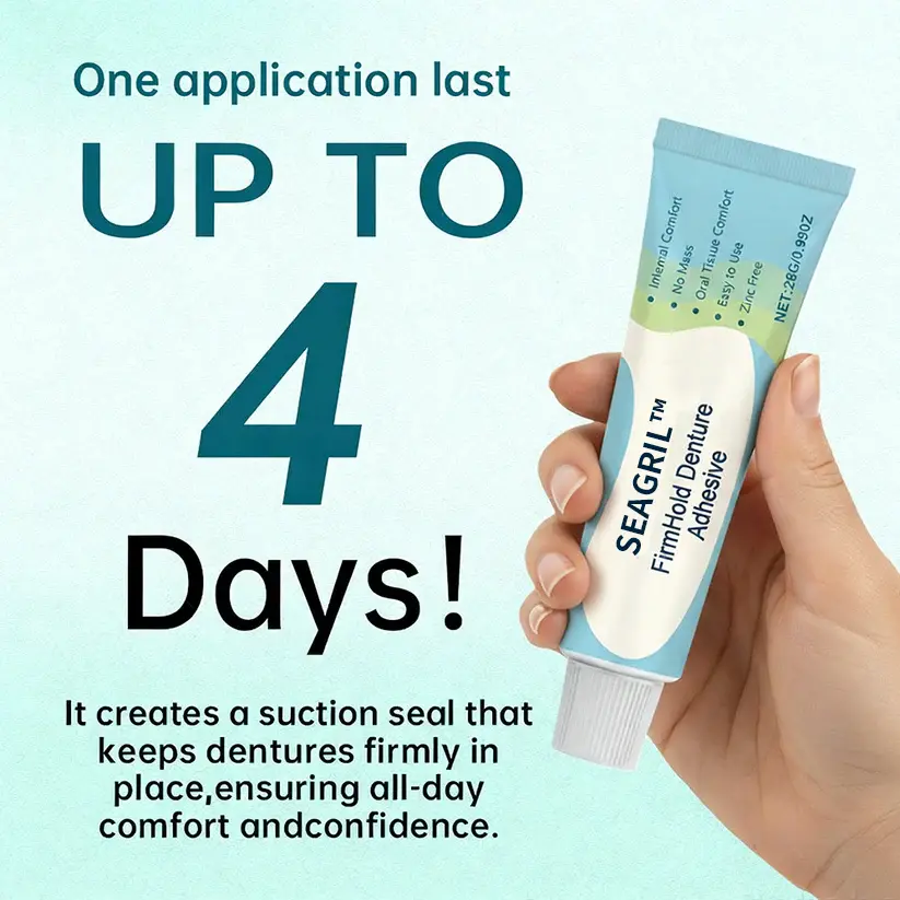 ✅ Waterproof and Mess-Free: Once set, the adhesive becomes completely waterproof and resistant to food particles, saliva, and heat. No sticky, pasty residue like gels or creams—SEAGRIL® keeps everything clean, fresh, and locked in place, even through hot meals and drinks.